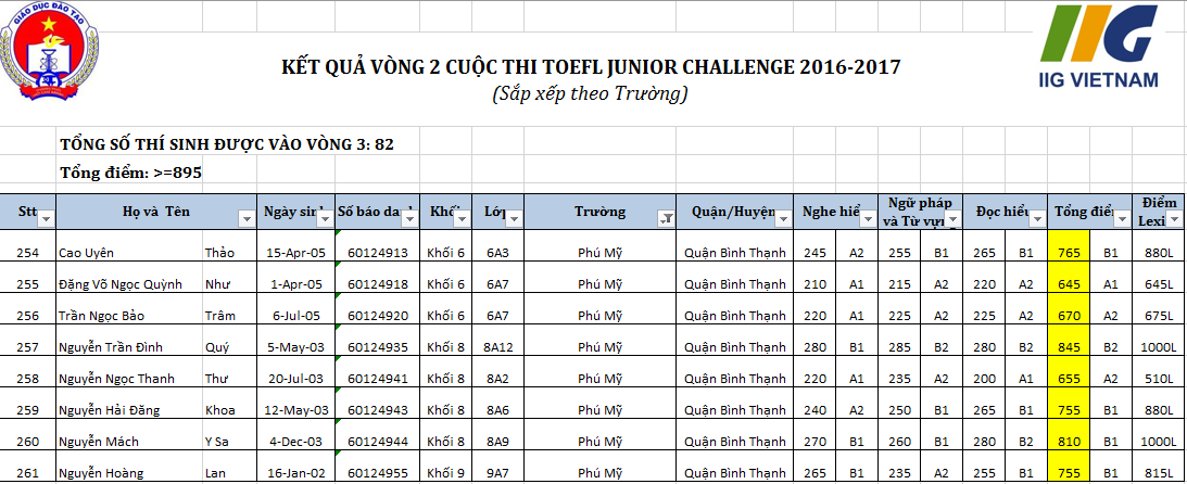 Chúc mừng các bạn có tên trên đã hoàn thành xuất sắc vòng 2 cuộc thi vô địch tiếng anh. Tất cả các bạn đều được nhận giấy chứng nhận có giá trị quốc tế, các bạn liên hệ với BTC (IIG Việt Nam - Điện thoại: 08.3.9905888 cuộc thi để biết thêm thông tin nhé.
