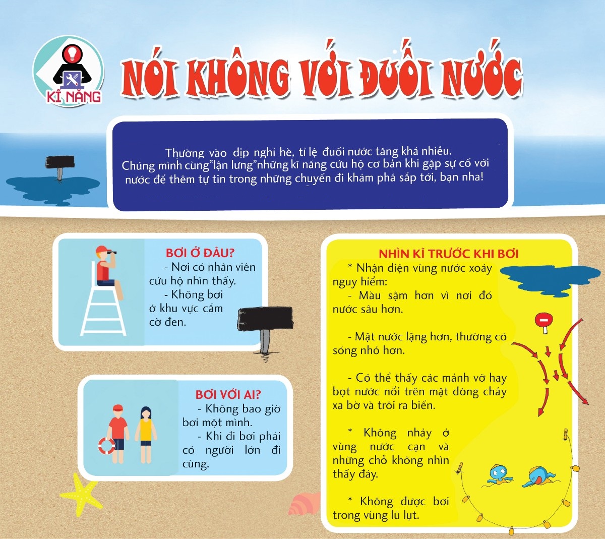 Nghỉ hè luôn là thời điểm được các bạn học sinh, sinh viên háo hức chờ đợi, bởi đây là thời gian các bạn tạm gác lại chuyện đèn sách để vui chơi thỏa thích, tự thưởng cho mình bằng những chuyến du lịch khám phá thiên nhiên, học hỏi cuộc sống thực tế qua các chuyến tham quan dã ngoại… sau một năm nỗ lực phấn đấu học tập. Còn gì sảng khoái cho bằng khi được tắm và ngâm mình trong dòng nước mát lạnh vào những buổi trưa hè nóng nực để quên đi những lo toan muộn phiền trong cuộc sống. Tuy vậy, đôi lúc vì quá mải mê vui chơi hoặc thiếu trang bị kiến thức về đuối nước đã dẫn đến một số tai nạn đáng tiếc. Bạn hãy ghi nhớ một số bí kíp dưới đây để chúng ta cùng "NÓI KHÔNG VỚI ĐUỐI NƯỚC" nhé!!!